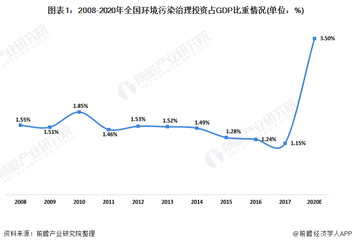 根據國家統計局數據,全國環境污染治理總投資從2008年的4937億元增加到2017年的9539億元,年復合增長率6.81%。雖然我國環境污染治理投資逐年上升,但截至2017年,我國環境污染治理投資占gdp的比重僅為1.2%。從國際經驗來看,當環境污染治理投資占gdp的比例在1%-1.5%時,可以控制環境惡化的趨勢;當比例達到2%-3%時,環境可以有效得到改善。根據《全國城市生態保護與建設規劃(2015-2020年)》數據,到2020年,我國環保投資占gdp的比例不低于3.5%,環保投資有很大提升空間。